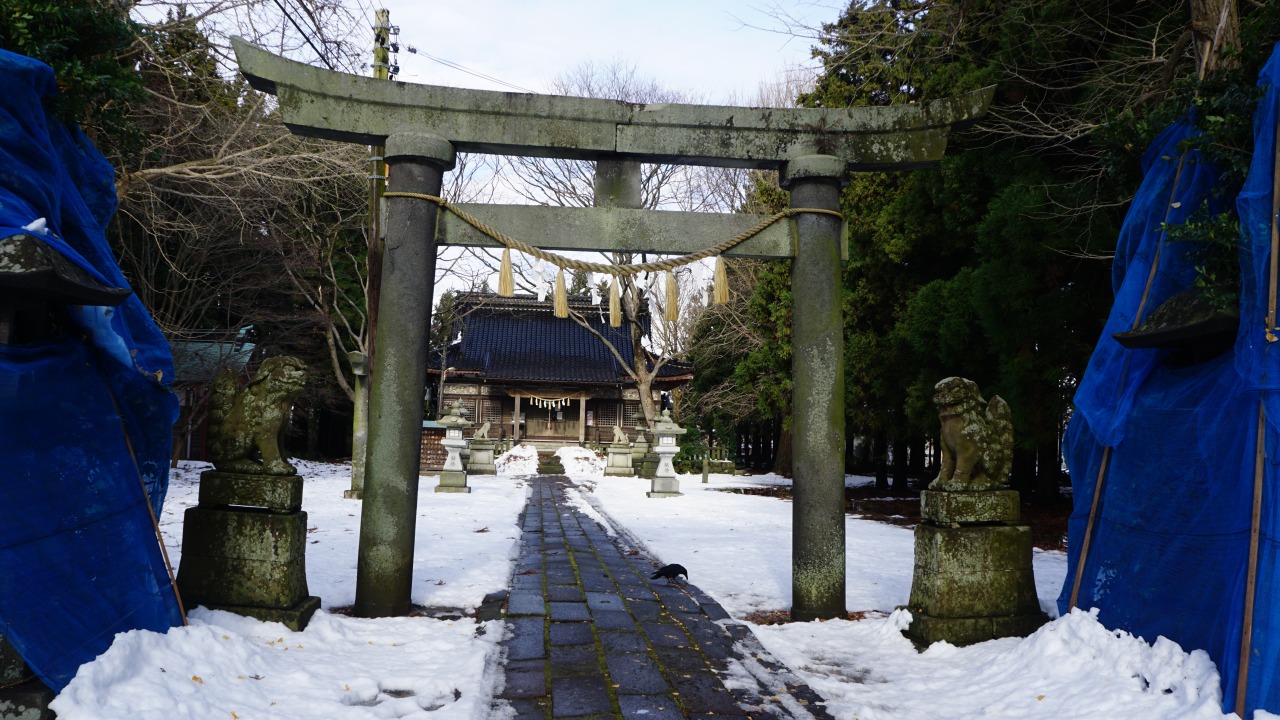※由利本荘市内にある「本荘八幡神社」。笏谷石の狛犬と自然災害伝承碑が見どころ。