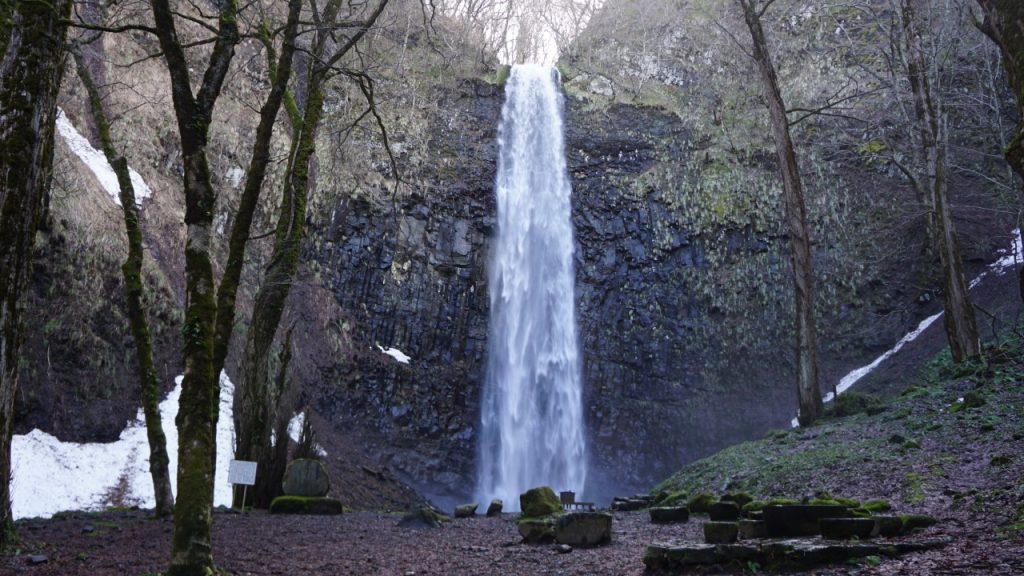 御嶽神社の御神体である「玉簾の滝」。杉の木立に加え、ポンポン石や目洗い石などが見どころ。