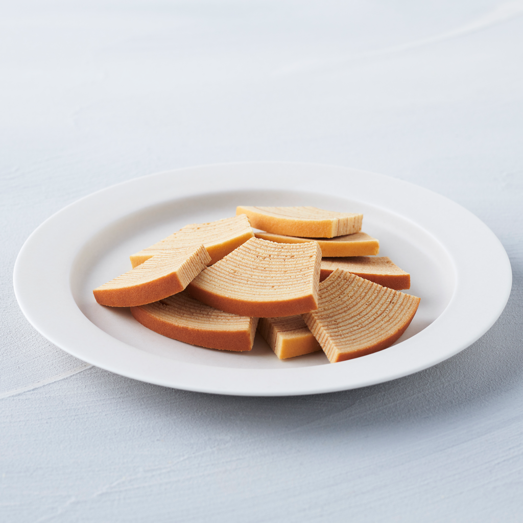 庄内平野で育った優良品種「はえぬき」の米粉で作ったバームクーヘンを薄くスライスして、じっくり焼き上げたラスクです。バームクーヘンの層は、「巨大な自然のダム」といわれる鳥海山の地層をイメージしています。庄内浜の海水でつくった「北前塩」を合わせて仕上げ、甘じょっぱい味わいと新食感が後引く一品です。